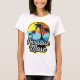 Este logotipo circular, atraente aos olhos, apresenta uma vibrante e retrorinspirada cena solar tropical moldada por uma borda amarela arrojada. Dentro ao círculo, as silhuetas de três palmeiras ficam altas contra um céu gradiente que se transforma de amarelo quente no topo para laranja feroz e vermelho próximo ao horizonte — evocando a hora do ouro sobre um paraíso da ilha. Abaixo, bandas em camadas de turquesa e azul profundo representam ondas oceânicas calmas, completando a vibração da praia idílica.
