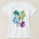 Folhas tropicais coloridas de palmeiras, monstera, flores de plumeria e aves do paraíso.