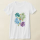 Folhas tropicais coloridas de palmeiras, monstera, flores de plumeria e aves do paraíso.