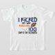 Esta design moderna mostra o texto "Eu chutei meu caminho por 100 dias de escola" em tipografia azul, preta e laranja acentuada com futebol. #100daysofSchool #futebol #gridiron #americanFootball #escola #game #game #game #diversão #na moda moderno #elegante #estilo #tendências #ao ar livre #garotos #boicotes #roupas #grithingshirts #crianças #crianças #presentes #gifts #giftsforboys