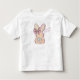 Este charmoso design apresenta um coelho de cor pastel com um grande e elegante arco rosa amarrado ao pescoço. As orelhas do coelho são enfeitadas com tons suaves de amarelo, azul e rosa, acrescentando um toque caprichoso. O corpo do coelho é esboçado com efeito de glitulação, dando-lhe uma aparência brilhante. Na base, um padrão em forma de coração em cores pastel de rosa, azul e amarelo adiciona um detalhe doce e amoroso. Esta design alegre e divertida é perfeita para uma camiseta alegre e festiva, capturando a essência da alegria e da beleza.