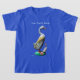 Pato de madeira pintado e esculpido com seu patinho, fortemente curado, sobre fundo azul. Adicione seu próprio texto.