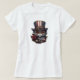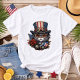 A richly detailed steampunk-style cat portrait infused with Americana charm. The dignified gray-and-white cat gazes forward with striking crimson eyes, wearing brass-rimmed goggles and an ornate top hat decorated in red, white, and blue with embossed stars. Gears, clocks, and metallic accents frame the composition, symbolizing time, craftsmanship, and heritage. A deep red rose adds a touch of elegance, while a ribbon patterned with the American flag wraps gracefully through the design.