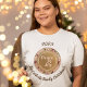Personalize esta t-shirt para a sua família neste feriado. Paz e Joy. Esta camiseta fofa combina uma design de tipografia minimalista em rosa e ouro. O padrão de fundo floral foi criado a partir de um desenho original a lápis de cor de uma poinsettia. Desejos de paz e alegria são a mensagem perfeita para qualquer ocasião, Natal, Ano Novo, ou evento que você comemore esta temporada de festas. Este trabalho de arte elegante cria um olhar bonito e clássico para todos os seus presentes e artesanatos nesta temporada de férias. —> NOTA: o ano e o texto na parte inferior do círculo são totalmente personalizáveis, no entanto, as palavras Paz e Joy não podem ser editadas ou alteradas. Este produto não tem folha de alumínio real.