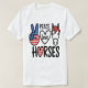 Esta camiseta branca apresenta um sinal de paz colorido com a bandeira americana, a palavra "PEACE", um coração contendo a palavra "Love", uma cabeça de cavalo de desenho animado vestindo uma bandana vermelha com estrelas brancas, e a palavra "HORSES" com um coração colorido como a bandeira americana substituindo o "O". Esta design combina temas patrióticos com amor por cavalos e paz.