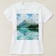 The painting shows a clear lake with turquoise water reflecting the blue sky and white clouds.