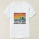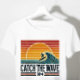 Aqui está outro design de camiseta estilo vintage com tendências que apresenta uma paisagem de pôrs do sol retrorados com um fundo de explosão solar e a frase "pegar a onda" Avise-me se você quiser mudanças! 🌄 ✨