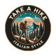 PEGUE UM ESTILO ITALIANO HIKE escrito em estilo emblema circular com uma ilustração de uma pessoa com uma mochila e um pau ambulante numa trilha montanhosa. Este design está disponível em homens e mulheres e em várias cores.