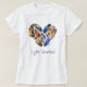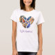 Camiseta branca com design de penas de aquarelas em forma cardíaca. As cores incluem amarelo, laranja, azul, verde e marrom. Alguns têm listras, pontos, padrões tribais e outros arranjos decorativos únicos. Texto (que é personalizável) diz de coração leve.