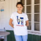 Amor da Pensilvânia - a Pensilvânia em letras maiúsculas vermelhas, com a palavra amada preenchida com a bandeira estadual. A letra O apaixonada é a silhueta com o esboço do estado da Pensilvânia.