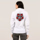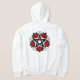Pentagrama preto com padrão, decorado com floração, rosas vermelhas com folhas em fundo branco. Tatuagem.
