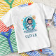 Camisa de bebê personalizada com um garoto astronauta bonitinho na lua com um planeta sorridente e estrelas.