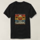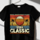 Aqui está um design de t-shirt retrógrada, que apresenta um pôr do sol clássico com listras em camadas, palmeiras, e uma textura angustiada, juntamente com a frase "Permanecer Clássico" 🌅 🌴 ✨