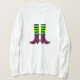 Esta camisa divertida tem pernas de bruxa. Ela está vestindo meias listradas negras e verdes e, é claro, suas botas roxas assustadoras.