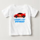 Camiseta personalizada do carro de corrida de primeiros aniversarios para bebês. Design de crianças bonitas com carro de músculo de brinquedo vermelho. Boa ideia para filho, neto, sobrinho. Ilustração do tema esporte de competição automática. Vestuário divertido para crianças pequenas, recém-nascidos e bebês