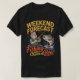 Esta camiseta preta mostra uma ilustração animada de uma pessoa alegre vestindo um boné vermelho e branco e um colete de pesca, enrolando em um peixe saltante. Acima da ilustração, o texto "WEEKEND FORECAST" é escrito em caracteres amarelo-negrito. Abaixo, a palavra "pesca" é exibida com uma letra azul e vermelha estilizada, seguida de "WITH A CHANCE OF Beer" com uma letra vermelha menor. O fundo mostra um lago estilizado ou cena oceânica. Esta design sugere brincadeira um plano de fim de semana que combina pesca com o prazer da cerveja.