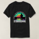 Esta design colorida dos anos 80 mostra um homem pescando sobre um fundo cênico. As palavras dizem, "Passei a herança dos meus filhos na pesca."