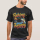 Esta design apresenta uma camiseta preta com a palavra "Pesca" no topo, com uma letra estilizada amarela e azul. Abaixo de "Pesca" está "-Meu-" em um roteiro vermelho menor. Abaixo de "-My-" está a palavra "Terapia" em uma fonte azul e laranja estilizada. A design inclui um gráfico de uma vara de pesca e um peixe saltando da água.