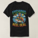 Esta camiseta preta mostra um desenho animado de um homem barbudo vestindo um chapéu e uma jaqueta, orgulhosamente segurando um peixe grande que ele pegou. Acima dele, a palavra "FISHING" é escrita em caracteres grandes, azuis e verdes, com a palavra "THE" em caracteres menores, brancos e curvos. Abaixo do homem e do peixe, a frase "REEL DEAL" é apresentada em caracteres de gradiente laranja, cor de laranja e amarelo. O fundo mostra uma cena ensolarada do lago com árvores. Esta design celebra a satisfação de uma viagem de pesca bem-sucedida.