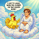 Este desenho animado engraçado e colorido apresenta um frango anjo amarelo rindo compartilhando uma nuvem fofa ao lado de um homem anjo mais velho, ambos com halos e asas. O pintinho está contando uma piada maliciosa em um balão de fala ousado que diz "Eu tive que rir quando você engasgou com aquele osso de frango." O fundo são céus celestiais brilhantes e mais nuvens fofas. Esta ilustração engraçada é perfeita para quem ama comédia excêntrica, arte de animais de desenho animado e designs de piadas leves. E, claro, veganos e vegetarianos.