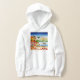 The image is a watercolor painting depicting a picturesque scene with colorful houses, palm trees, bicycles, a boat at sea, and pyramids in the background.