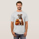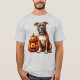 Uma ilustração detalhada de um cão pitbull sentado ao lado de abóboras de Halloween esculpidas, mostrando um tema festivo e lúdico de Halloween