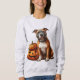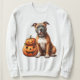 Uma ilustração detalhada de um cão pitbull sentado ao lado de abóboras de Halloween esculpidas, mostrando um tema festivo e lúdico de Halloween