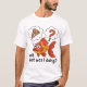 Esta roupa branca apresenta um peixe-balão laranja de desenho animado com olhos grandes, aparentemente confuso. Acima dos peixes estão duas bolhas de pensamento, uma contendo uma fatia de pizza e outra um ponto de interrogação. O texto "Espera... O que eu estava fazendo?" está impresso abaixo do peixe. É uma design para pizzas amantes e aqueles com senso de humor.