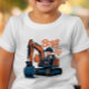 Um menino se senta alegremente sobre um enorme escavador amarelo, seus pés pendurados ao lado, enquanto explorava o canteiro de obras com curiosidade.