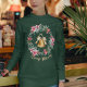 Faça uma declaração sazonal ousada com esta camisola acolhedora feminina em verde florestal rico. No centro, uma coroa festiva de poinsettias, bagas ocas e galhos de pínus armam um sotaque ouro. O texto personalizável permite adicionar seu nome de família, cartões de natal ou frase de Natal favorita. Uma na moda, mas confortável, escolha para passagens de férias, aparência de família correspondente ou lumbre-fogo.