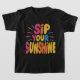 Este desenho de t-shirt é a sua dose diária de vitamina D...felicidade! "Sip Your Sunshine" é exibido em um esquema alegre de multicores, com cada letra uma explosão de amarelo-sol, laranja e rosa brilhante. A fonte lúdica é ousada e levemente inclinada para cima, como se chegasse ao sol, brilhando com otimismo. Pequenas formas solares ou raios espiam por detrás do texto, adicionando um toque de cinzas. Este design é um lembrete de verão para saborear os bons tempos e encontrar alegria em todos os belos dias.