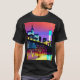 Tee em uma pintura digital da linha do horizonte da Nova Iorque, com a ponte do Brooklyn à noite, em tons vívidos de rosa azul e fuchsia profunda