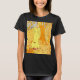 Uma mulher em voga com casaco amarelo de comprimento de cheio está entre as árvores, com suas folhas ficando cor e caindo durante o outono.