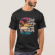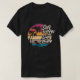 Esta roupa preta apresenta um design circular com uma cena de praia tropical. Palmeiras e uma cadeira de praia abrigadas contra um pôr do sol listrado em tons de rosa, laranja e amarelo, sobre um oceano azul. O texto "Salt Water and Sun Shine" é escrito em letra casual. Ele evoca um relaxado humor de férias na praia.