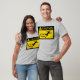 Sinal de precaução amarelo e preto com piranhas perseguindo uma figura de palito.