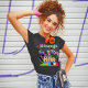 t-shirt preta Hanes Nano, de uso feminino, com uma imagem de placas de tinta vermelha, laranja, amarela, verde e azul, tênis de topo elevado em cores neonatais, fitas cassetes, óculos de sol coloridos e o texto "Preso nos anos 80" em letras neonatais. Veja toda a coleção de Roupa Tubular 80s nos TOUCHES ESPECIAIS | Seção Favoritos para festas.