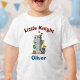 Esta camiseta personalizada de primeiro aniversário apresenta o número "1" representado como uma robusta torre de castelo de pedra, completa com ameias, bandeiras e estandartes com cruzes medievais. Um pequeno e fofo cavaleiro blindado está pronto ao lado do castelo, segurando uma espada e um escudo.