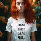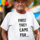 PRIMEIRO ELES VIERAM POR... escrito em letras negros verticais e em negrito. Esta camisa está disponível em vários estilos, tamanhos e cores.