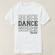 Esta imagem apresenta uma t-shirt branca com a palavra "DANCE" repetida várias vezes num arranjo empilhado, ligeiramente distorcido. Abaixo do texto empilhado, a palavra "professor" é escrita em uma fonte menor, escrita à mão.
