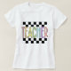 Camiseta colorida de professor com borda marcada.