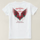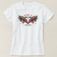 "PROSPERIDADE E LUZ." Uma camiseta moderna com um impressão artístico ousado nas costas. O elemento visual principal é uma composição de rosas vermelhas brilhantes, folhas verdes e espirais decorativas que formam a forma de asas de anjo ou um coração. Colorindo elementos de tinta ou de aquarela para um efeito artístico suave, a frase "PROSPERITY AND LIGHT" é ligeiramente curvada no topo numa letra serif ousada e elegante. Na parte inferior está a citação: "Em cada sonho vive a magia da possibilidade" numa fonte viscosa e viscosa. O esquema de cores inclui vermelhos, verdes e pinks suaves em um fundo branco. Estilo: ilustração da moda, impressão digital boho-chic moderno, de alta resolução, adequado para a moda de rua ou de boutique.