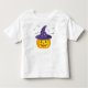 A t-shirt de uma criança fofa do Halloween inclui morcegos voadores roxos e uma abóbora laranja vestindo um chapéu de bruxa roxa cheio de estrelas brancas cintilantes. Personalize o texto ao seu gosto.