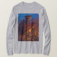 Um dragão azul excelente, iluminado pelas chamas abaixo, está sobre as ruínas da "Mancha Vermelha".