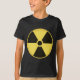 O símbolo da radiação, preto no amarelo, com falso claro envelhece rachaduras. Os t-shirt, suam, botões, as bolsas, etiquetas, presentes.