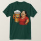 Cette image humoristique et colorée représente une femme joyeuse en t-shirt rouge posant avec un verre de bière anthropomorphique, affichant un grand sourire et un signe de victoire. Les deux personnages partagent un moment complice dans une ambiance décontractée, festive et chaleureuse.