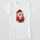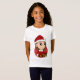 Camiseta infantil com ilustração de uma garota sorridente e fofa, de cabelos castanhos compridos, a garota está vestindo uma fantasia de Santa Cláusula com um chapéu vermelho e segurando um presente