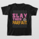 A t-shirt apresenta um design ousado, estilo grafite, com o texto "Slay then Parfait" em cores vibrantes. O fundo apresenta um salto de tinta, acrescentando ao apelo dinâmico e atraente do design.