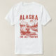 Esta camiseta branca apresenta uma ilustração monocromática ao estilo do desenho vermelho de uma mãe urso grizzly e seu filhote sentados ao lado de um rio numa paisagem selvagem do Alasca. Montanhas, árvores e um sol de ascensão ou de fixação estão representados no fundo. A palavra "ALASKA" é impressa em vermelho a negrito no topo, e "A ÚLTIMA FRONTEIRA" em letras vermelhas menores no fundo.
