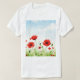 The image shows a watercolor painting of a field of red poppies under a blue sky with clouds.