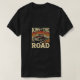 a design de camiseta ao estilo "vintage" rústica, com um caminhão clássico dos anos 50 a conduzir por uma autoestrada aberta com um fundo de pôr do sol e a frase "Rei da Estrada" 🚛 🌅 ✨